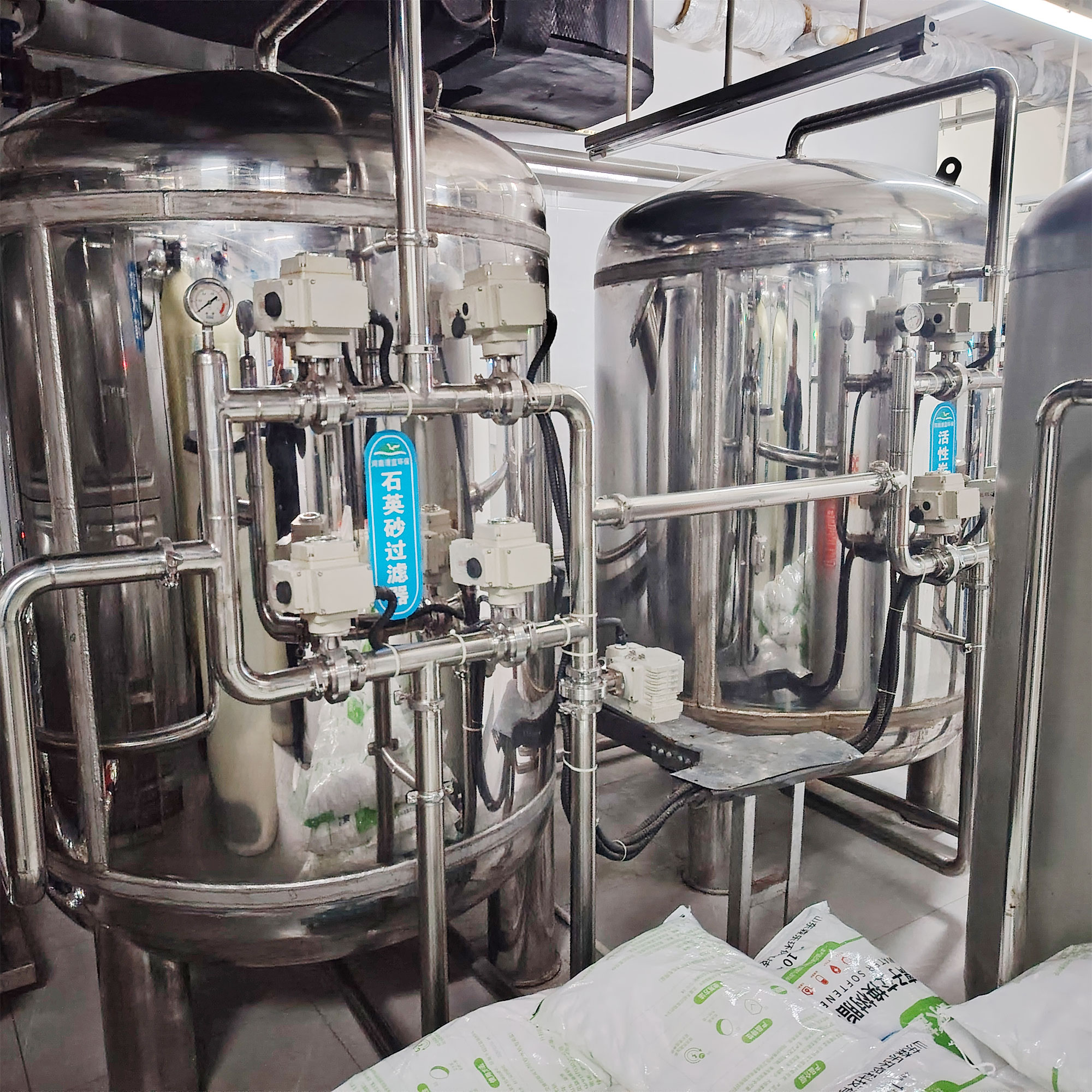 - 管路采用不锈钢材质,焊接/卡箍连接工艺精良,走向规整,标识清晰(如“石英砂”、“活性炭”蓝色标牌),便于识别与维护。